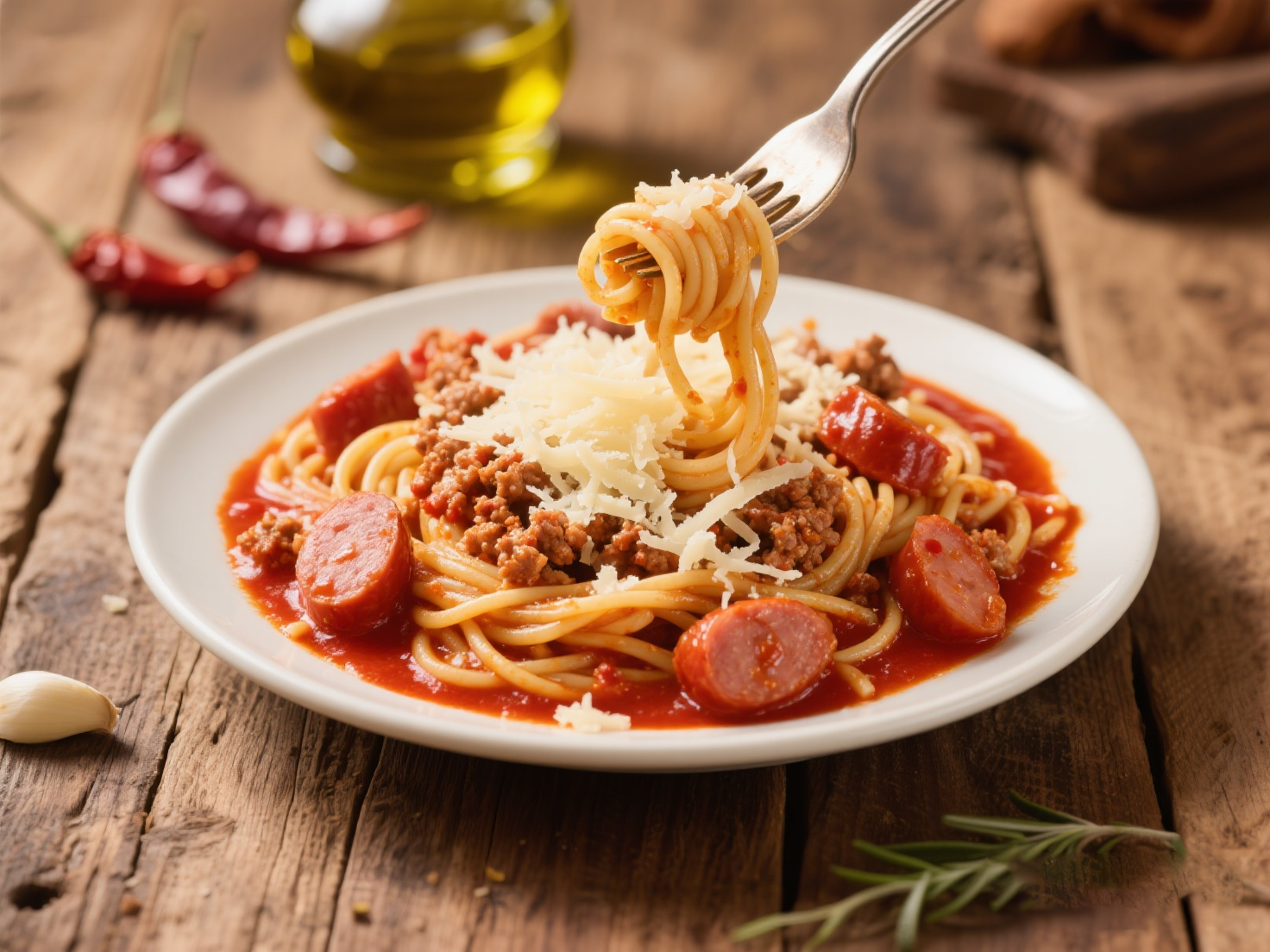 特點(diǎn): 香腸油脂融入番茄醬汁,辣味激發(fā)肉香
