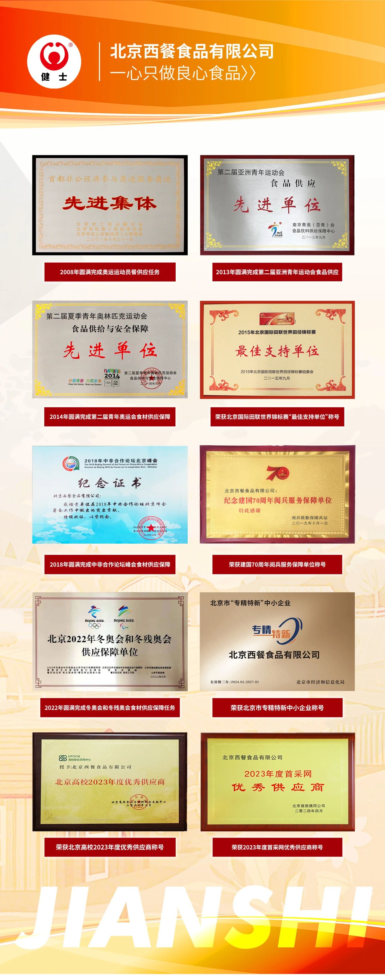 作為北京市高新技術(shù)企業(yè)、北京市農(nóng)業(yè)產(chǎn)業(yè)化龍頭企業(yè)、北京市專精特新中小企業(yè)以及北京市創(chuàng)新型中小企業(yè),公司通過 HACCP、FSSC22000 等國際體系認證,憑借 “健士” 品牌的卓越口碑,連續(xù)服務(wù)北京奧運會、冬奧會、一帶一路高峰論壇等40余項國家級重大活動,以零事故的保障記錄贏得贊譽。