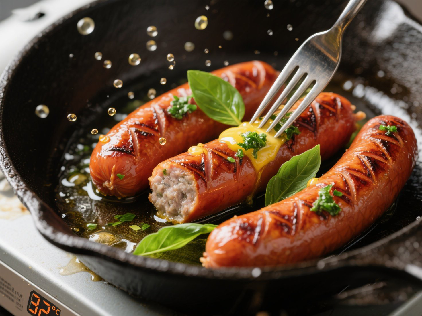② 煎制:冷鍋放香腸 → 中火煎1分鐘 出油 → 轉(zhuǎn)小火加蓋煎 4分鐘→ 開蓋 轉(zhuǎn)中火煎30秒 上脆皮