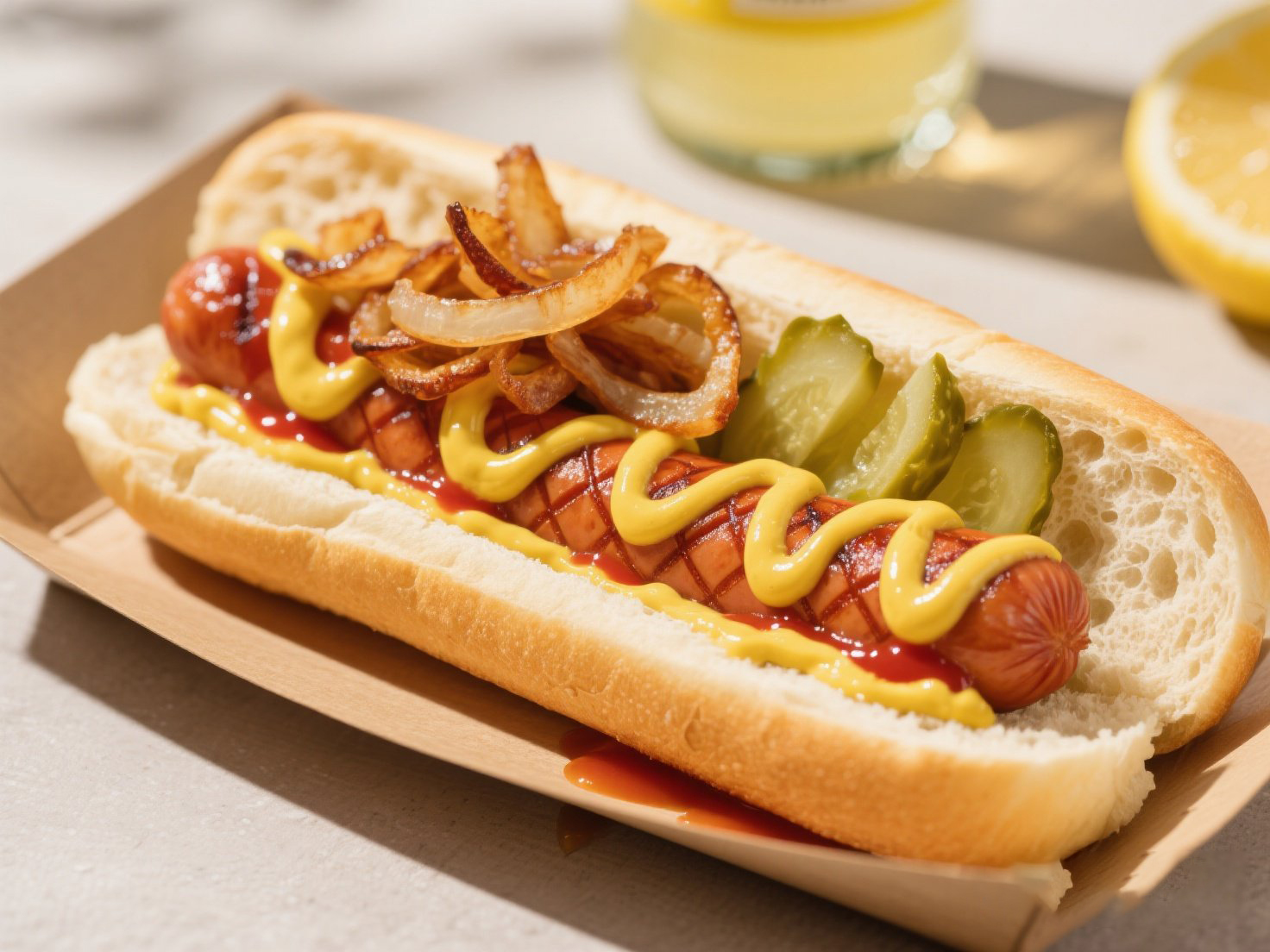 ④組合定型:面包內(nèi)壁先擠混合醬,放入香腸,撒焦糖洋蔥絲,鋪酸黃瓜片+生菜絲,表面Z字形擠醬(增加視覺(jué)層次)
