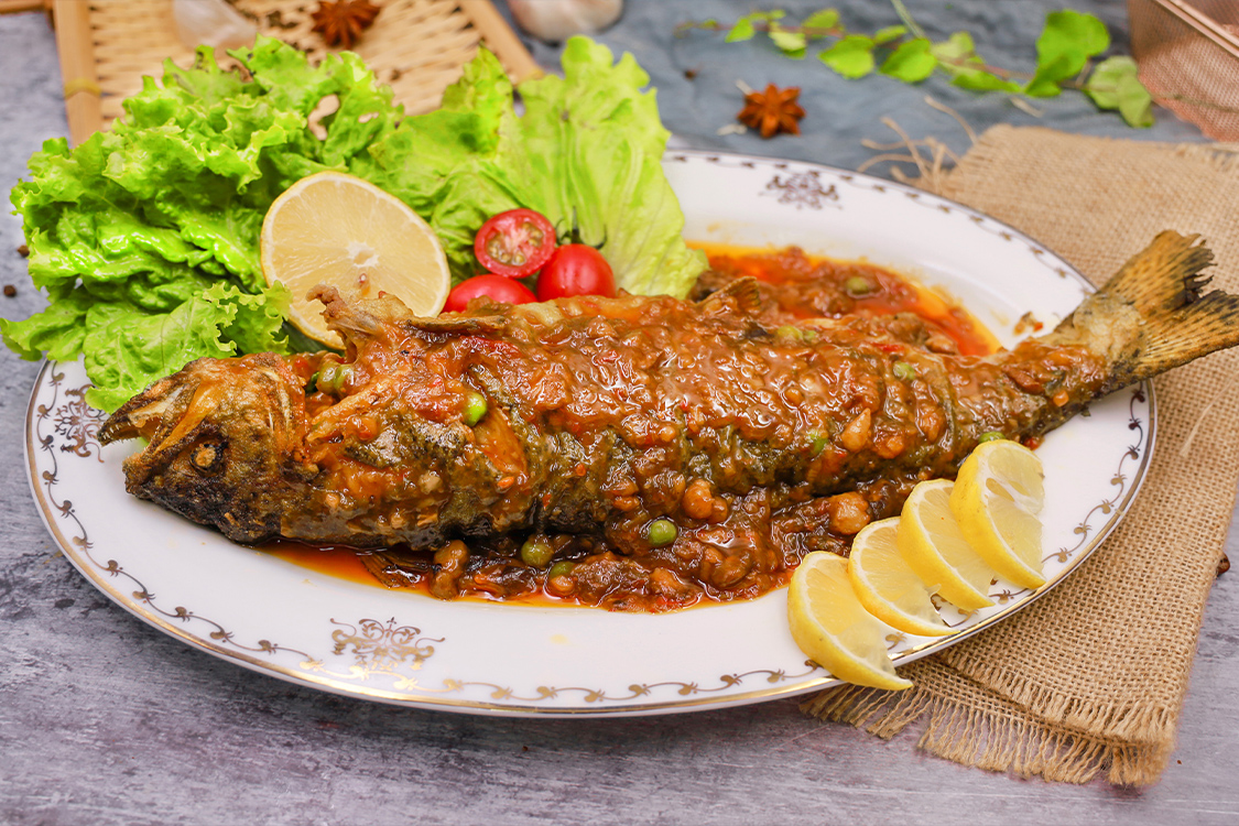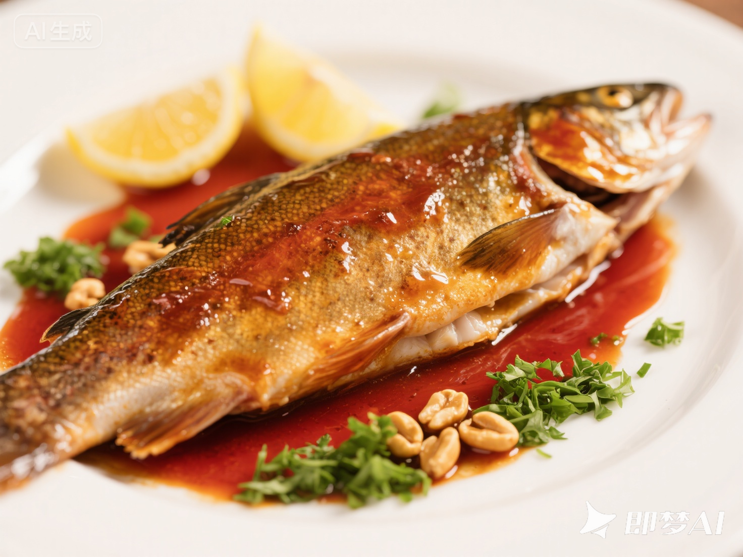 ③ 裝盤點(diǎn)綴: 將加熱好的虹鱒魚小心盛入盤中,將鍋底或包裝內(nèi)的剩余醬汁淋在魚身上;