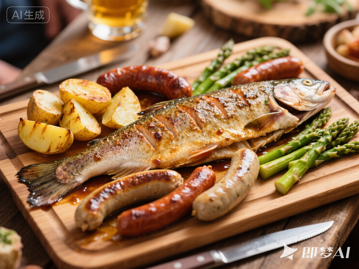 ④ 組合拼盤:取一個(gè)大號(hào)木質(zhì)砧板或長(zhǎng)盤,將加熱好的虹鱒魚、香腸、烤土豆和蘆筍豪邁地?cái)[放上去,營(yíng)造豐盛的分享氛圍。